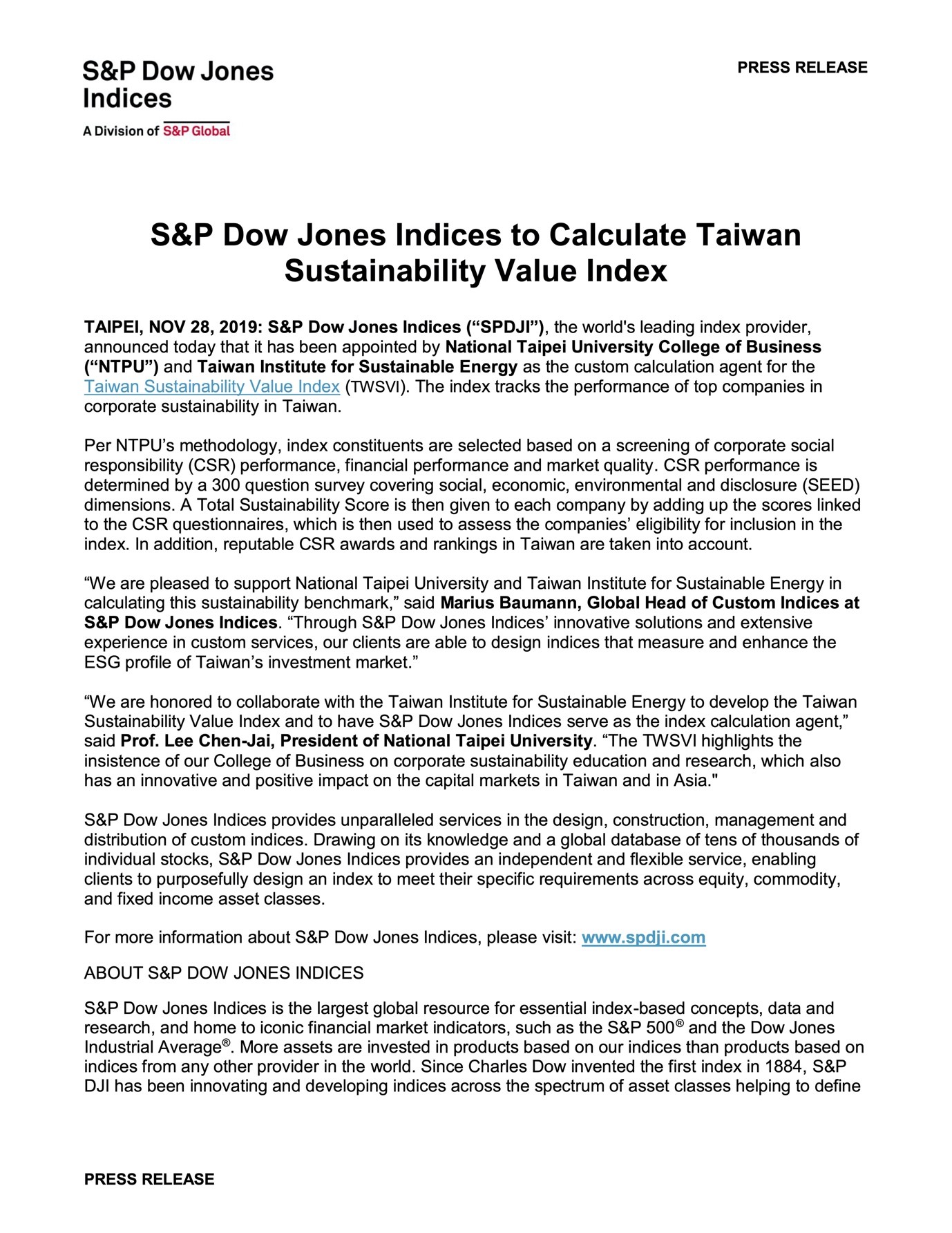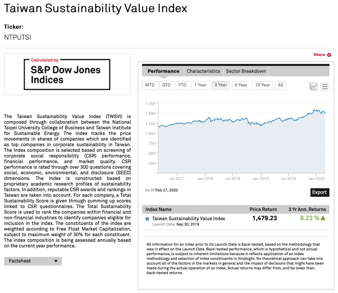 為「台灣永續價值指數」 (Taiwan Sustainability Value Index; TWSVI),並於2019年11月28日,TWSVI由國際知名指數公司S&P Global進行嚴謹計算與維護,並正式公布於S&P官方網頁: