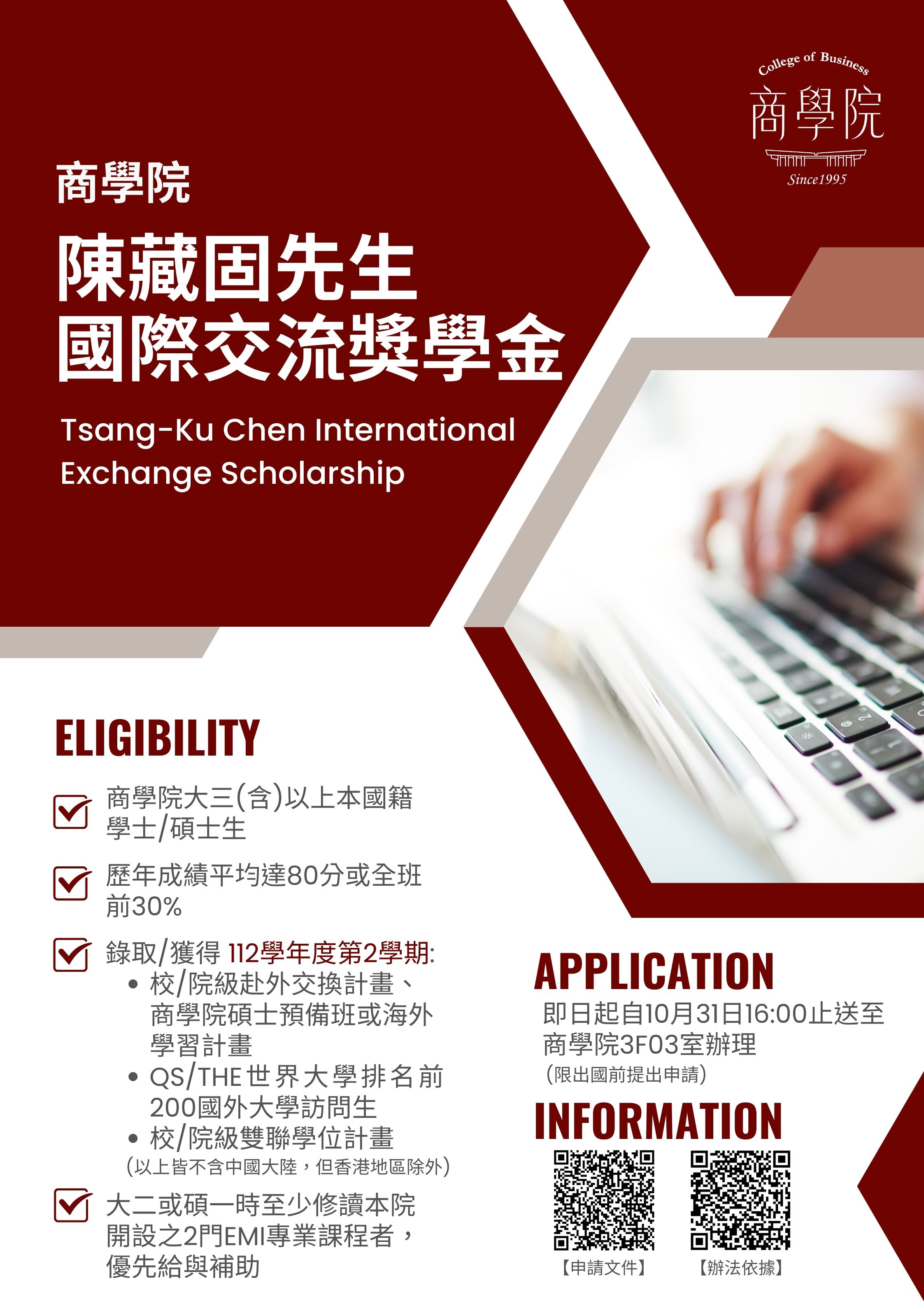 陳藏固先生國際交流獎學金自即日起開放112.01赴外學生提出申請。