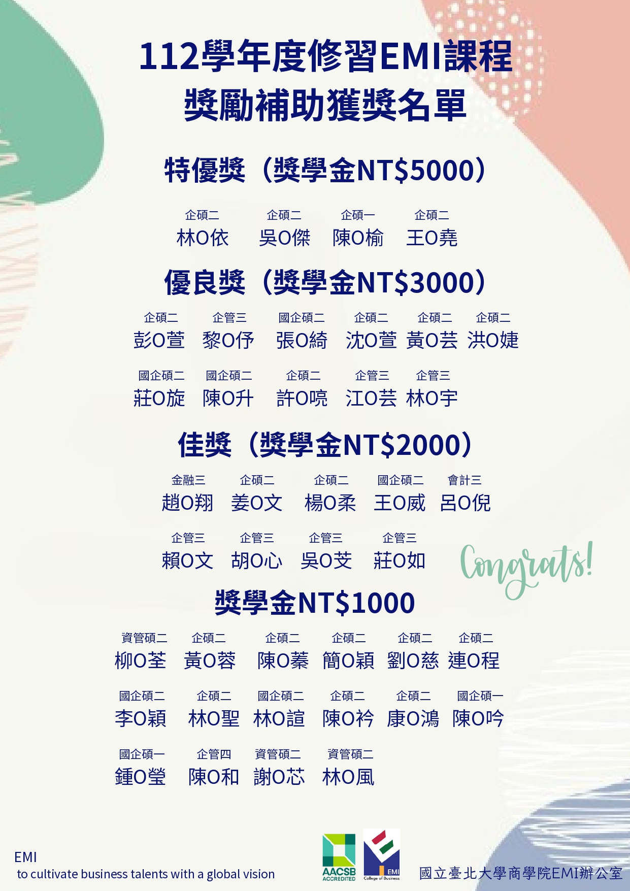 「112學年度修習EMI課程獎勵補助獲獎名單」