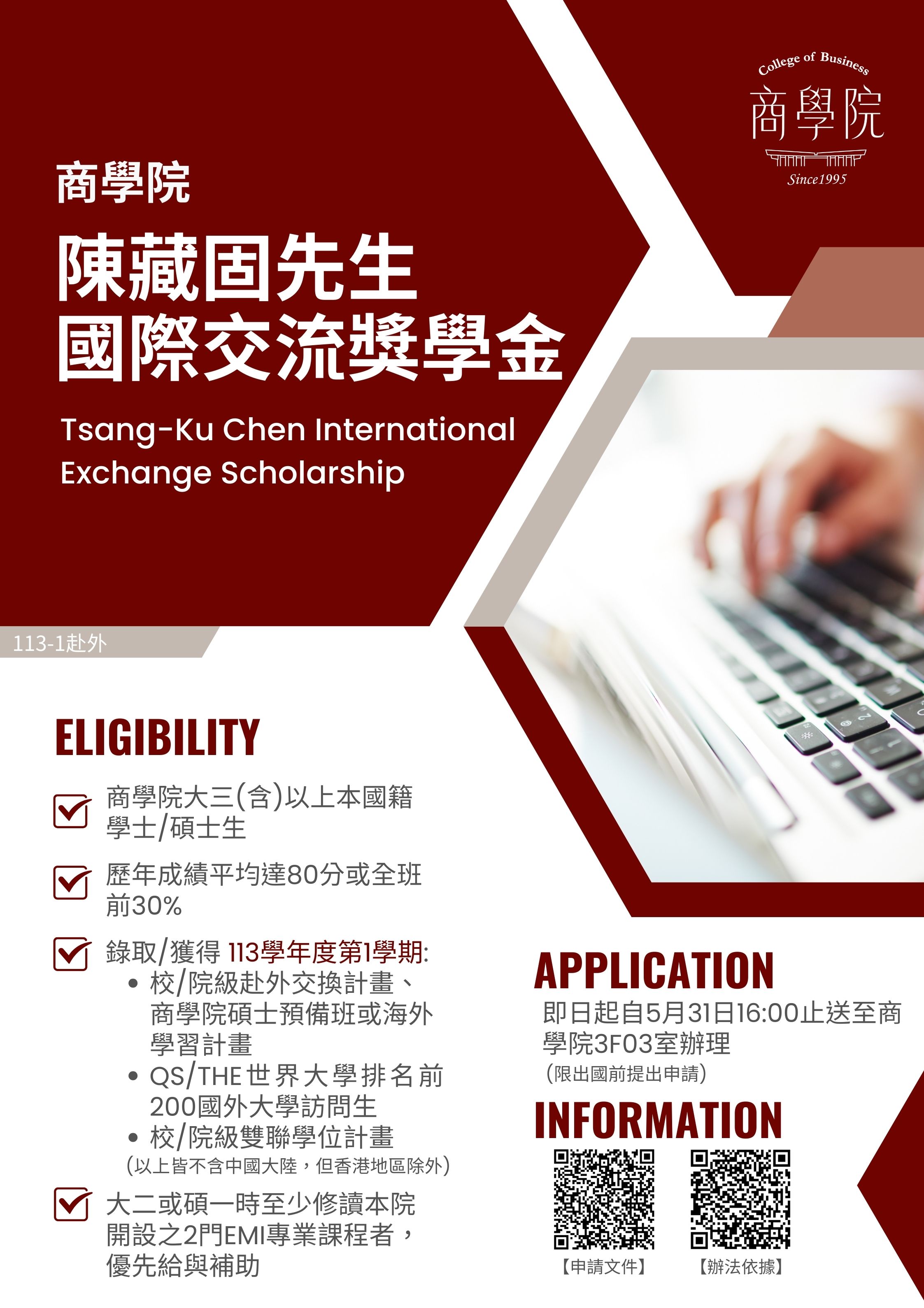 陳藏固先生國際交流獎學金自即日起開放113學年度第1學期赴外學生提出申請。