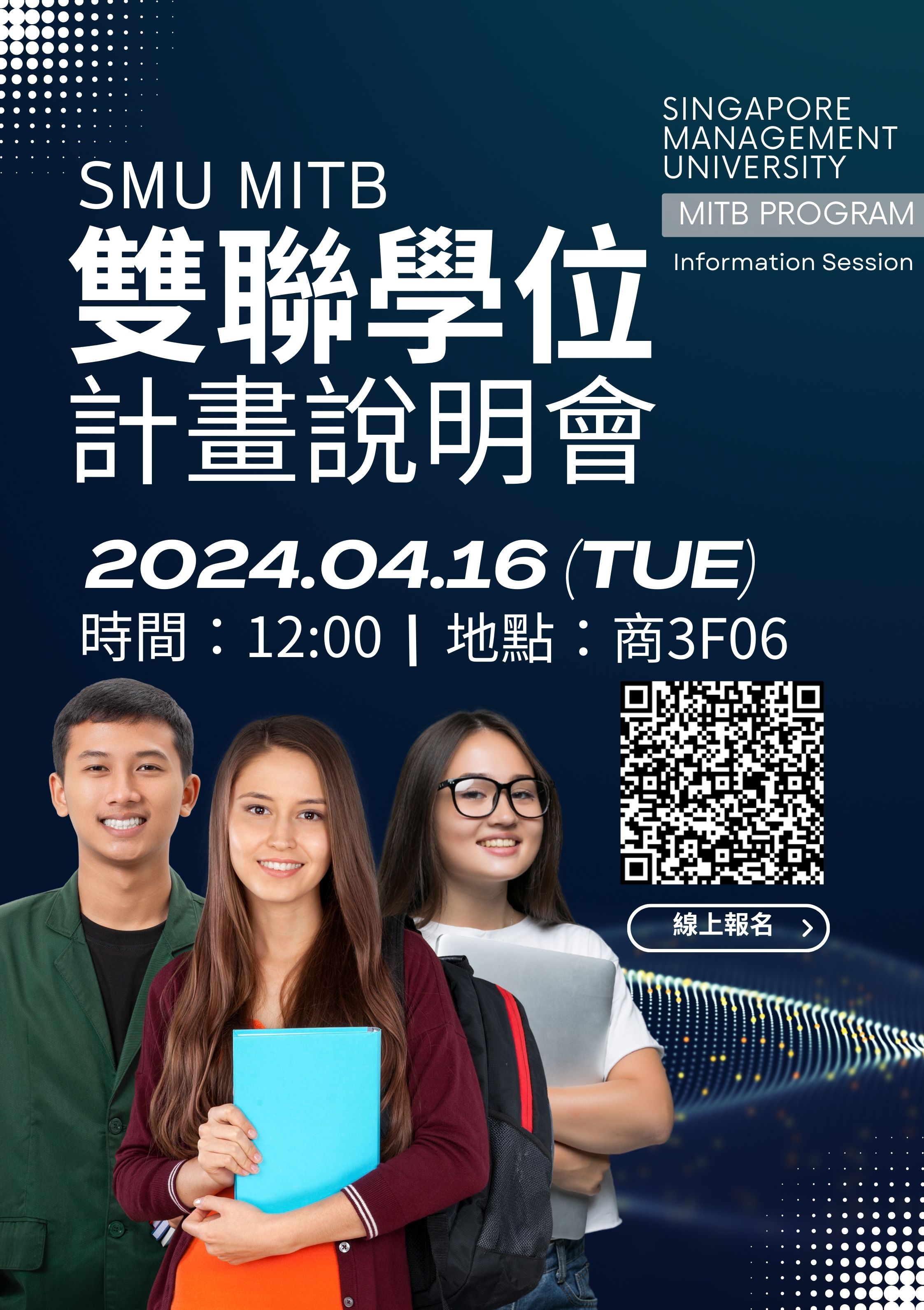 合作校新加坡管理大學 School of Computing and Information Systems Master of IT in Business(MITB) Program將於113年4月16日(二)辦理雙聯學位計畫說明會,本次主講人為Dr. TAN Kar Way (MITB Analytics Track執行長),想要了解更多關於MITB 計畫的同學千萬不要錯過!