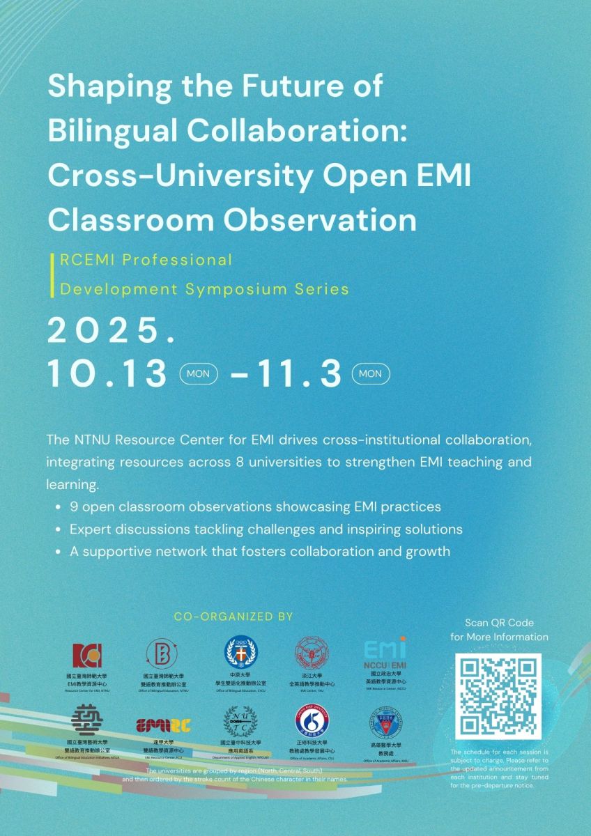 國立臺灣師範大學EMI教學資源中心於114學年度第1學期,與中原大學、正修科技大學、逢甲大學、國立政治大學、國立臺中科技大學、國立臺灣藝術大學、高雄醫學大學及淡江大學合作舉辦九場《跨校公開觀議課》及四場《雙語聯盟圓桌會議》。