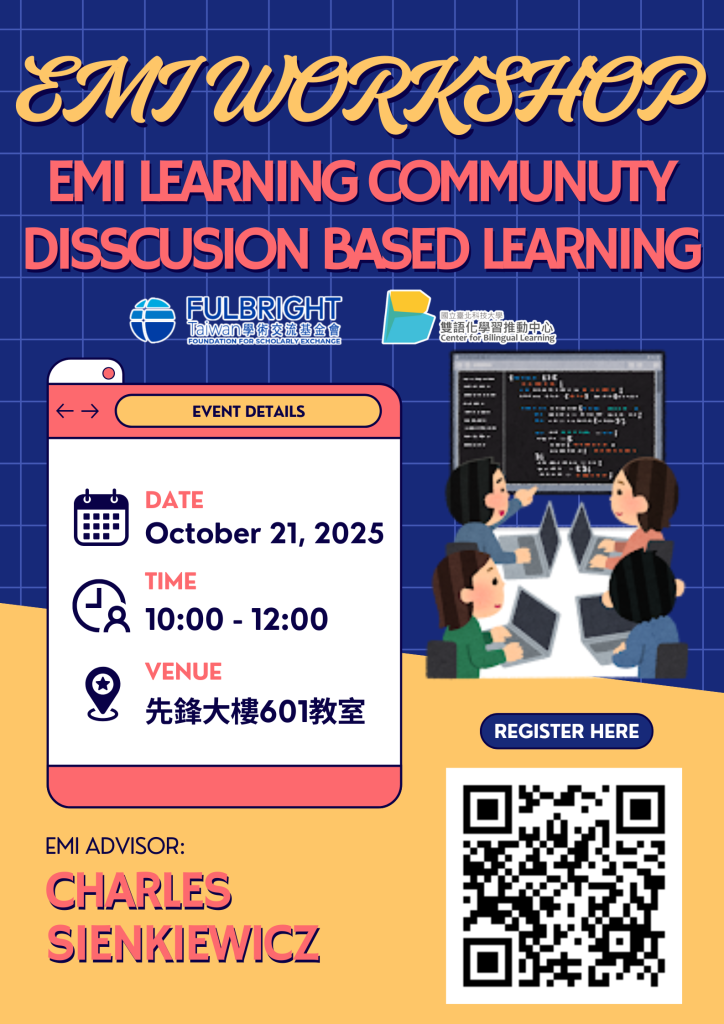 一、國立臺北科技大學雙語中心與Fulbright Taiwan學術交流基金會協同規劃之活動,透過美籍專業教學顧問辦理EMI教學增能工作坊,協助教師提升全英語授課之專業知能,持續發展EMI課程之實務成效。
