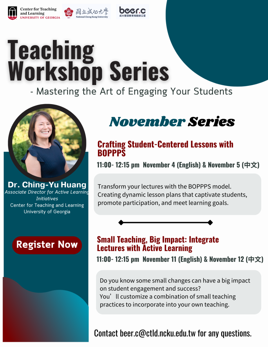 為協助教師掌握創新教學策略,打造以學生為中心的學習體驗,成大雙語教育推動辦公室(BEER.c)再度攜手美國喬治亞大學教學與學習中心合作,推出11月全新主題的線上EMI教師工作坊(Active Learning Workshop Series for Teachers-Nov)!